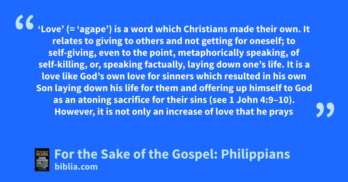 ‘Love’ (= ‘agape’) is a word which Christians made their own. It relates to giving to others and not getting for oneself; to self-giving, even to the point, metaphorically speaking, of self-killing, or, speaking factually, laying down one’s life. It is a love like God’s own love for sinners which resulted in his own Son laying down his life for them and offering up himself to God as an atoning sacrifice for their sins (see 1 John 4:9–10). However, it is not only an increase of love that he prays