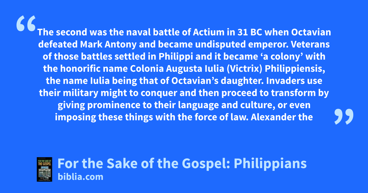 The second was the naval battle of Actium in 31 BC when Octavian defeated Mark Antony and became undisputed emperor. Veterans of those battles settled in Philippi and it became ‘a colony’ with the honorific name Colonia Augusta Iulia (Victrix) Philippiensis, the name Iulia being that of Octavian’s daughter. Invaders use their military might to conquer and then proceed to transform by giving prominence to their language and culture, or even imposing these things with the force of law. Alexander the