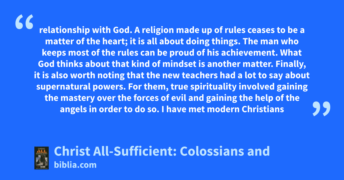 relationship with God. A religion made up of rules ceases to be a matter of the heart; it is all about doing things. The man who keeps most of the rules can be proud of his achievement. What God thinks about that kind of mindset is another matter. Finally, it is also worth noting that the new teachers had a lot to say about supernatural powers. For them, true spirituality involved gaining the mastery over the forces of evil and gaining the help of the angels in order to do so. I have met modern Christians
