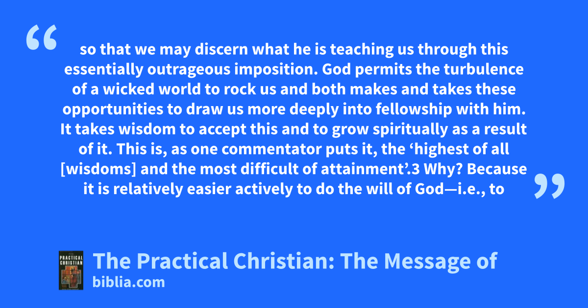 so that we may discern what he is teaching us through this essentially outrageous imposition. God permits the turbulence of a wicked world to rock us and both makes and takes these opportunities to draw us more deeply into fellowship with him. It takes wisdom to accept this and to grow spiritually as a result of it. This is, as one commentator puts it, the ‘highest of all [wisdoms] and the most difficult of attainment’.3 Why? Because it is relatively easier actively to do the will of God—i.e., to