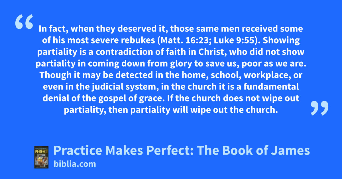 In fact, when they deserved it, those same men received some of his most severe rebukes (Matt. 16:23; Luke 9:55). Showing partiality is a contradiction of faith in Christ, who did not show partiality in coming down from glory to save us, poor as we are. Though it may be detected in the home, school, workplace, or even in the judicial system, in the church it is a fundamental denial of the gospel of grace. If the church does not wipe out partiality, then partiality will wipe out the church.