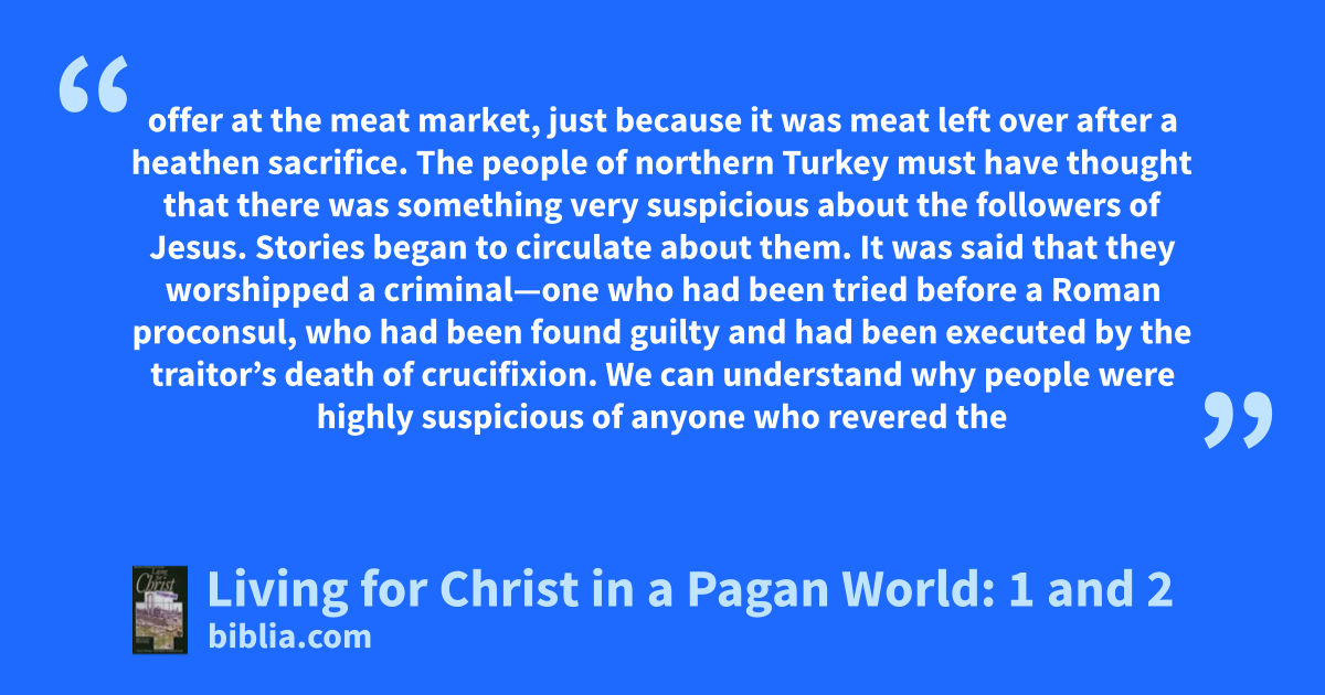 offer at the meat market, just because it was meat left over after a heathen sacrifice. The people of northern Turkey must have thought that there was something very suspicious about the followers of Jesus. Stories began to circulate about them. It was said that they worshipped a criminal—one who had been tried before a Roman proconsul, who had been found guilty and had been executed by the traitor’s death of crucifixion. We can understand why people were highly suspicious of anyone who revered the
