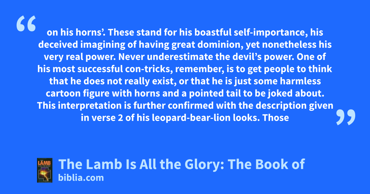 on his horns’. These stand for his boastful self-importance, his deceived imagining of having great dominion, yet nonetheless his very real power. Never underestimate the devil’s power. One of his most successful con-tricks, remember, is to get people to think that he does not really exist, or that he is just some harmless cartoon figure with horns and a pointed tail to be joked about. This interpretation is further confirmed with the description given in verse 2 of his leopard-bear-lion looks. Those
