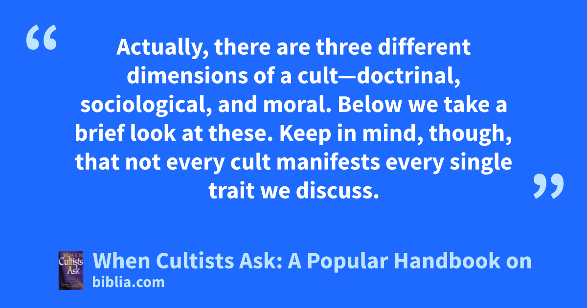 Actually, there are three different dimensions of a cult—doctrinal, sociological, and moral. Below we take a brief look at these. Keep in mind, though, that not every cult manifests every single trait we discuss.