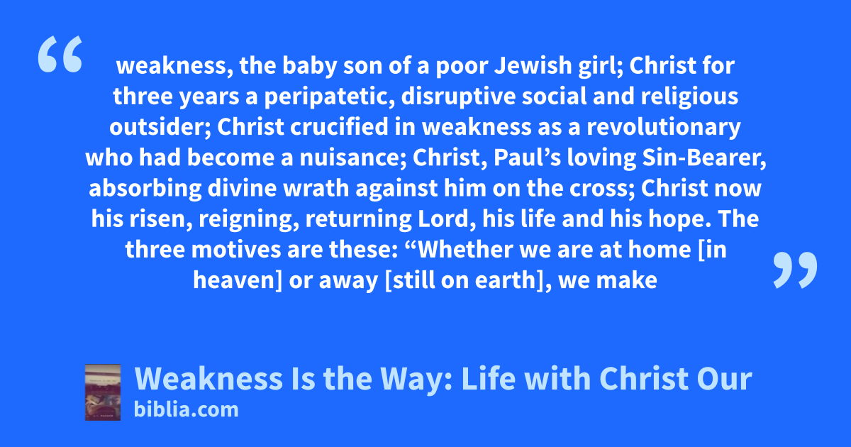 weakness, the baby son of a poor Jewish girl; Christ for three years a peripatetic, disruptive social and religious outsider; Christ crucified in weakness as a revolutionary who had become a nuisance; Christ, Paul’s loving Sin-Bearer, absorbing divine wrath against him on the cross; Christ now his risen, reigning, returning Lord, his life and his hope. The three motives are these: “Whether we are at home [in heaven] or away [still on earth], we make