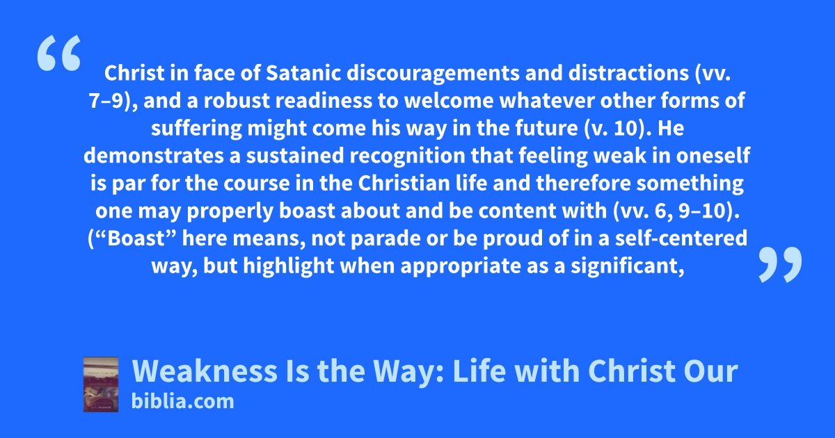 Christ in face of Satanic discouragements and distractions (vv. 7–9), and a robust readiness to welcome whatever other forms of suffering might come his way in the future (v. 10). He demonstrates a sustained recognition that feeling weak in oneself is par for the course in the Christian life and therefore something one may properly boast about and be content with (vv. 6, 9–10). (“Boast” here means, not parade or be proud of in a self-centered way, but highlight when appropriate as a significant,