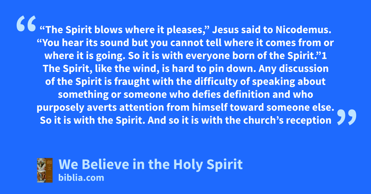 “The Spirit blows where it pleases,” Jesus said to Nicodemus. “You hear its sound but you cannot tell where it comes from or where it is going. So it is with everyone born of the Spirit.”1 The Spirit, like the wind, is hard to pin down. Any discussion of the Spirit is fraught with the difficulty of speaking about something or someone who defies definition and who purposely averts attention from himself toward someone else. So it is with the Spirit. And so it is with the church’s reception