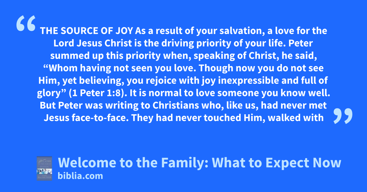 THE SOURCE OF JOY As a result of your salvation, a love for the Lord Jesus Christ is the driving priority of your life. Peter summed up this priority when, speaking of Christ, he said, “Whom having not seen you love. Though now you do not see Him, yet believing, you rejoice with joy inexpressible and full of glory” (1 Peter 1:8). It is normal to love someone you know well. But Peter was writing to Christians who, like us, had never met Jesus face-to-face. They had never touched Him, walked with