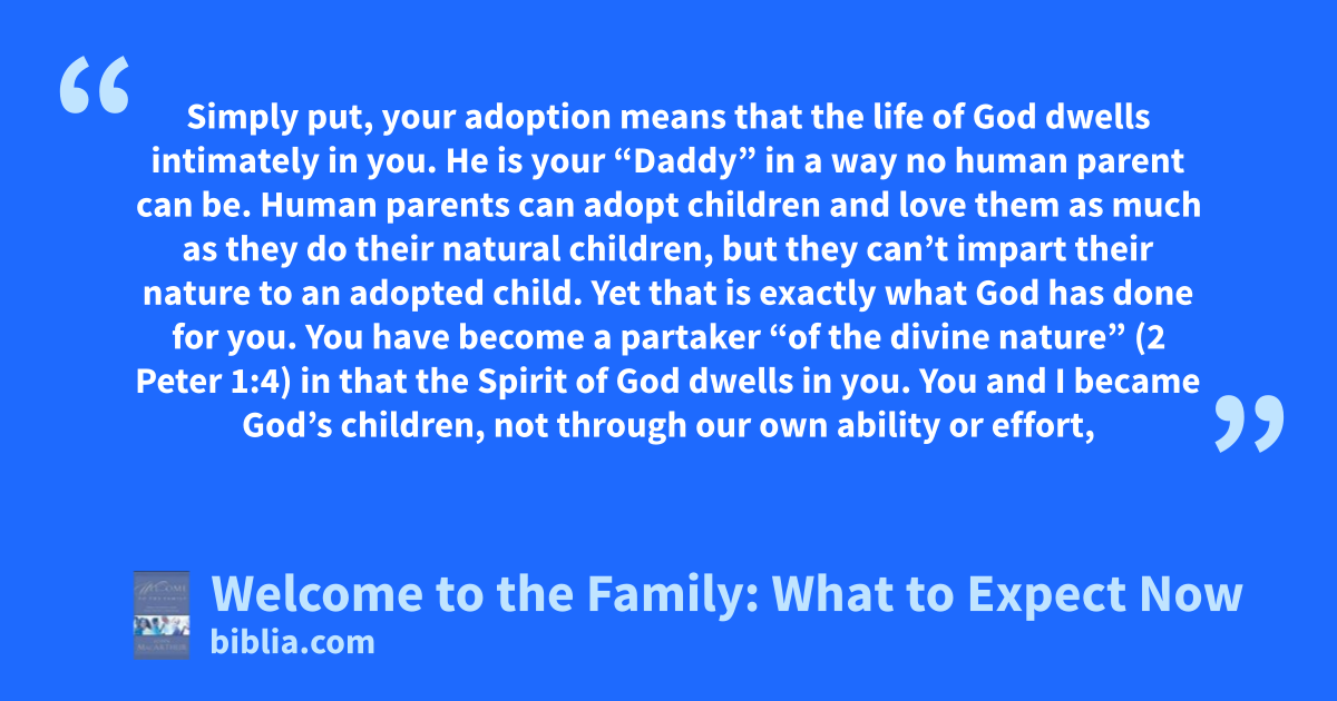 Simply put, your adoption means that the life of God dwells intimately in you. He is your “Daddy” in a way no human parent can be. Human parents can adopt children and love them as much as they do their natural children, but they can’t impart their nature to an adopted child. Yet that is exactly what God has done for you. You have become a partaker “of the divine nature” (2 Peter 1:4) in that the Spirit of God dwells in you. You and I became God’s children, not through our own ability or effort,
