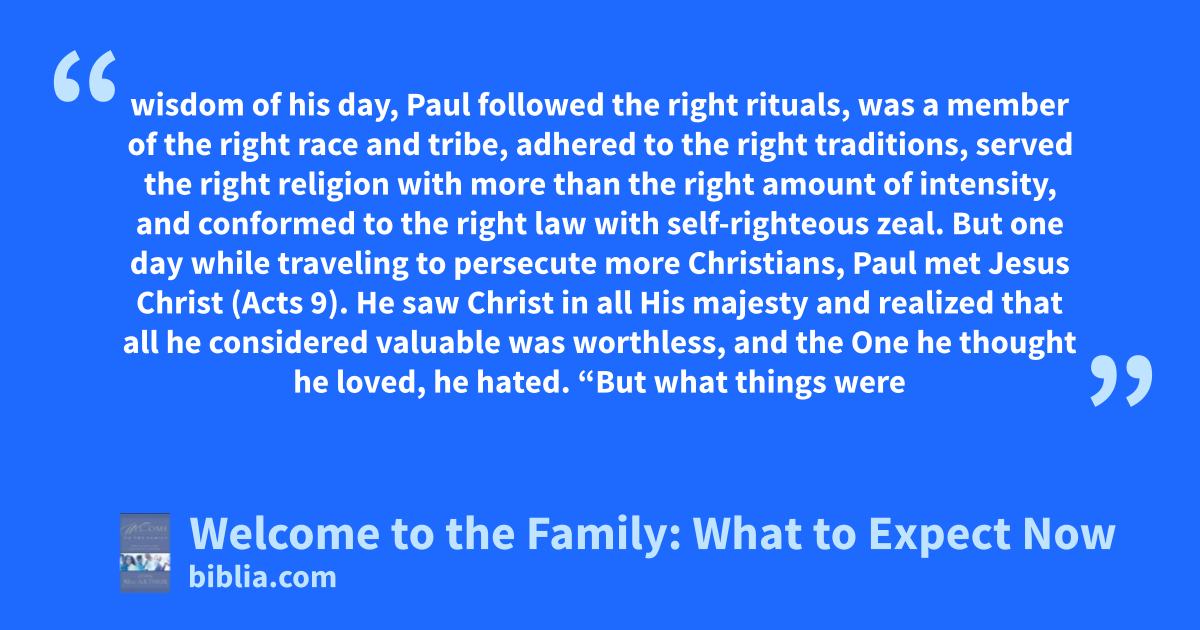 wisdom of his day, Paul followed the right rituals, was a member of the right race and tribe, adhered to the right traditions, served the right religion with more than the right amount of intensity, and conformed to the right law with self-righteous zeal. But one day while traveling to persecute more Christians, Paul met Jesus Christ (Acts 9). He saw Christ in all His majesty and realized that all he considered valuable was worthless, and the One he thought he loved, he hated. “But what things were