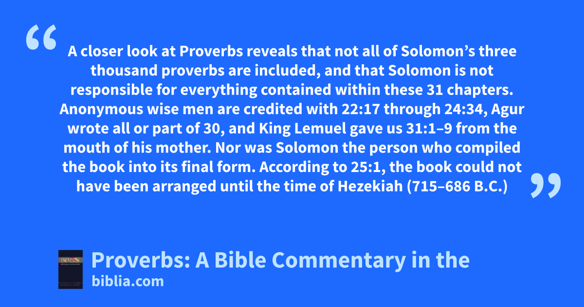 A closer look at Proverbs reveals that not all of Solomon’s three thousand proverbs are included, and that Solomon is not responsible for everything contained within these 31 chapters. Anonymous wise men are credited with 22:17 through 24:34, Agur wrote all or part of 30, and King Lemuel gave us 31:1–9 from the mouth of his mother. Nor was Solomon the person who compiled the book into its final form. According to 25:1, the book could not have been arranged until the time of Hezekiah (715–686 B.C.)