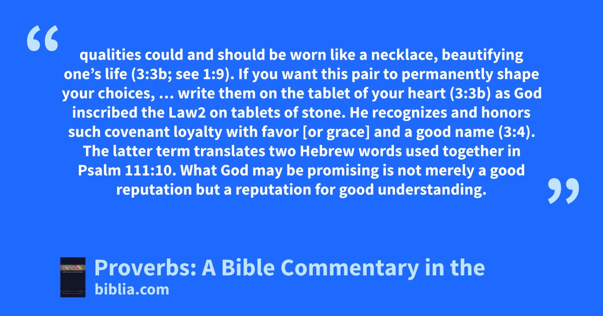 qualities could and should be worn like a necklace, beautifying one’s life (3:3b; see 1:9). If you want this pair to permanently shape your choices, … write them on the tablet of your heart (3:3b) as God inscribed the Law2 on tablets of stone. He recognizes and honors such covenant loyalty with favor [or grace] and a good name (3:4). The latter term translates two Hebrew words used together in Psalm 111:10. What God may be promising is not merely a good reputation but a reputation for good understanding.