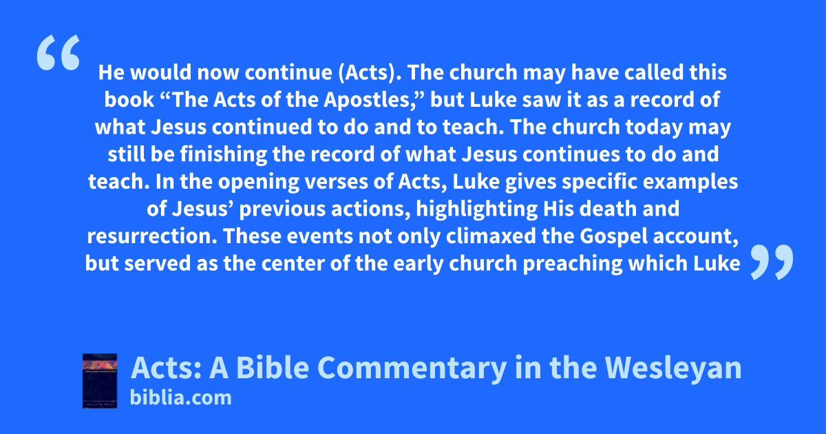 He would now continue (Acts). The church may have called this book “The Acts of the Apostles,” but Luke saw it as a record of what Jesus continued to do and to teach. The church today may still be finishing the record of what Jesus continues to do and teach. In the opening verses of Acts, Luke gives specific examples of Jesus’ previous actions, highlighting His death and resurrection. These events not only climaxed the Gospel account, but served as the center of the early church preaching which Luke
