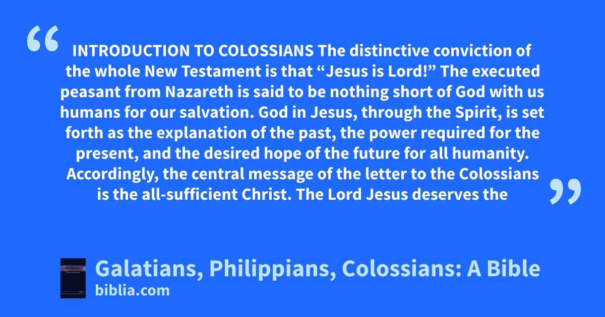 INTRODUCTION TO COLOSSIANS The distinctive conviction of the whole New Testament is that “Jesus is Lord!” The executed peasant from Nazareth is said to be nothing short of God with us humans for our salvation. God in Jesus, through the Spirit, is set forth as the explanation of the past, the power required for the present, and the desired hope of the future for all humanity. Accordingly, the central message of the letter to the Colossians is the all-sufficient Christ. The Lord Jesus deserves the