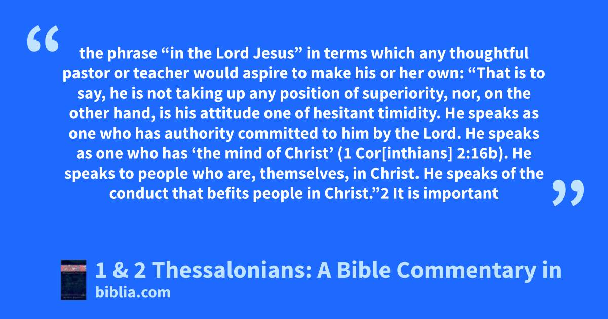 the phrase “in the Lord Jesus” in terms which any thoughtful pastor or teacher would aspire to make his or her own: “That is to say, he is not taking up any position of superiority, nor, on the other hand, is his attitude one of hesitant timidity. He speaks as one who has authority committed to him by the Lord. He speaks as one who has ‘the mind of Christ’ (1 Cor[inthians] 2:16b). He speaks to people who are, themselves, in Christ. He speaks of the conduct that befits people in Christ.”2 It is important