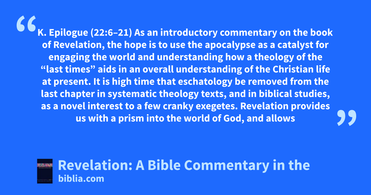 K. Epilogue (22:6–21) As an introductory commentary on the book of Revelation, the hope is to use the apocalypse as a catalyst for engaging the world and understanding how a theology of the “last times” aids in an overall understanding of the Christian life at present. It is high time that eschatology be removed from the last chapter in systematic theology texts, and in biblical studies, as a novel interest to a few cranky exegetes. Revelation provides us with a prism into the world of God, and allows