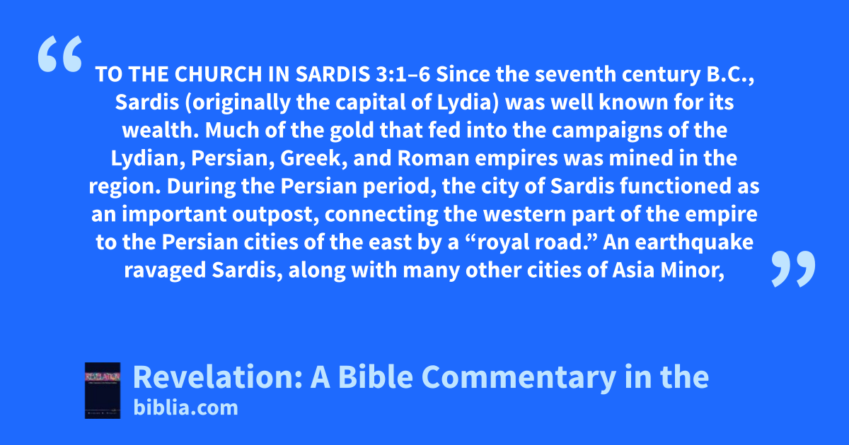 TO THE CHURCH IN SARDIS 3:1–6 Since the seventh century B.C., Sardis (originally the capital of Lydia) was well known for its wealth. Much of the gold that fed into the campaigns of the Lydian, Persian, Greek, and Roman empires was mined in the region. During the Persian period, the city of Sardis functioned as an important outpost, connecting the western part of the empire to the Persian cities of the east by a “royal road.” An earthquake ravaged Sardis, along with many other cities of Asia Minor,