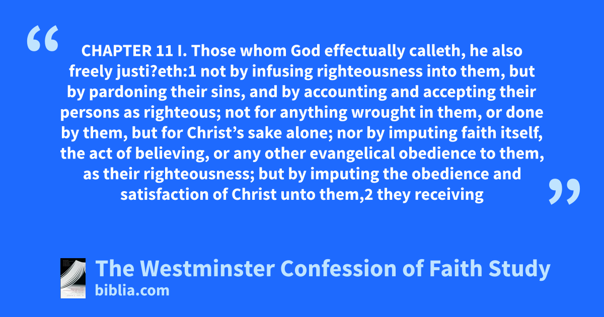 CHAPTER 11 I. Those whom God effectually calleth, he also freely justi?eth:1 not by infusing righteousness into them, but by pardoning their sins, and by accounting and accepting their persons as righteous; not for anything wrought in them, or done by them, but for Christ’s sake alone; nor by imputing faith itself, the act of believing, or any other evangelical obedience to them, as their righteousness; but by imputing the obedience and satisfaction of Christ unto them,2 they receiving