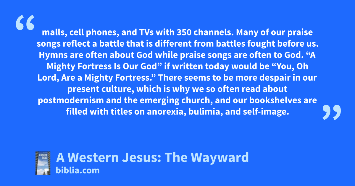 malls, cell phones, and TVs with 350 channels. Many of our praise songs reflect a battle that is different from battles fought before us. Hymns are often about God while praise songs are often to God. “A Mighty Fortress Is Our God” if written today would be “You, Oh Lord, Are a Mighty Fortress.” There seems to be more despair in our present culture, which is why we so often read about postmodernism and the emerging church, and our bookshelves are filled with titles on anorexia, bulimia, and self-image.