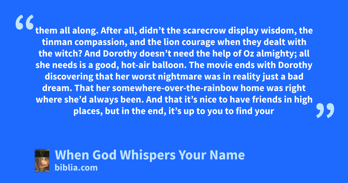 them all along. After all, didn’t the scarecrow display wisdom, the tinman compassion, and the lion courage when they dealt with the witch? And Dorothy doesn’t need the help of Oz almighty; all she needs is a good, hot-air balloon. The movie ends with Dorothy discovering that her worst nightmare was in reality just a bad dream. That her somewhere-over-the-rainbow home was right where she’d always been. And that it’s nice to have friends in high places, but in the end, it’s up to you to find your