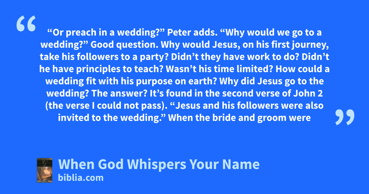 “Or preach in a wedding?” Peter adds. “Why would we go to a wedding?” Good question. Why would Jesus, on his first journey, take his followers to a party? Didn’t they have work to do? Didn’t he have principles to teach? Wasn’t his time limited? How could a wedding fit with his purpose on earth? Why did Jesus go to the wedding? The answer? It’s found in the second verse of John 2 (the verse I could not pass). “Jesus and his followers were also invited to the wedding.” When the bride and groom were