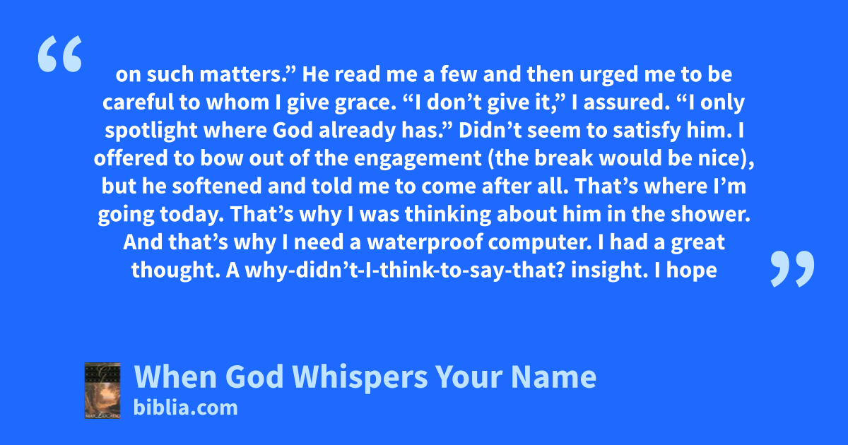 on such matters.” He read me a few and then urged me to be careful to whom I give grace. “I don’t give it,” I assured. “I only spotlight where God already has.” Didn’t seem to satisfy him. I offered to bow out of the engagement (the break would be nice), but he softened and told me to come after all. That’s where I’m going today. That’s why I was thinking about him in the shower. And that’s why I need a waterproof computer. I had a great thought. A why-didn’t-I-think-to-say-that? insight. I hope