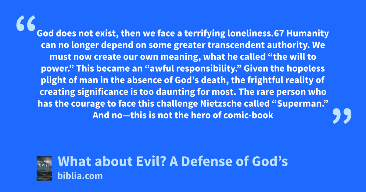 God does not exist, then we face a terrifying loneliness.67 Humanity can no longer depend on some greater transcendent authority. We must now create our own meaning, what he called “the will to power.” This became an “awful responsibility.” Given the hopeless plight of man in the absence of God’s death, the frightful reality of creating significance is too daunting for most. The rare person who has the courage to face this challenge Nietzsche called “Superman.” And no—this is not the hero of comic-book