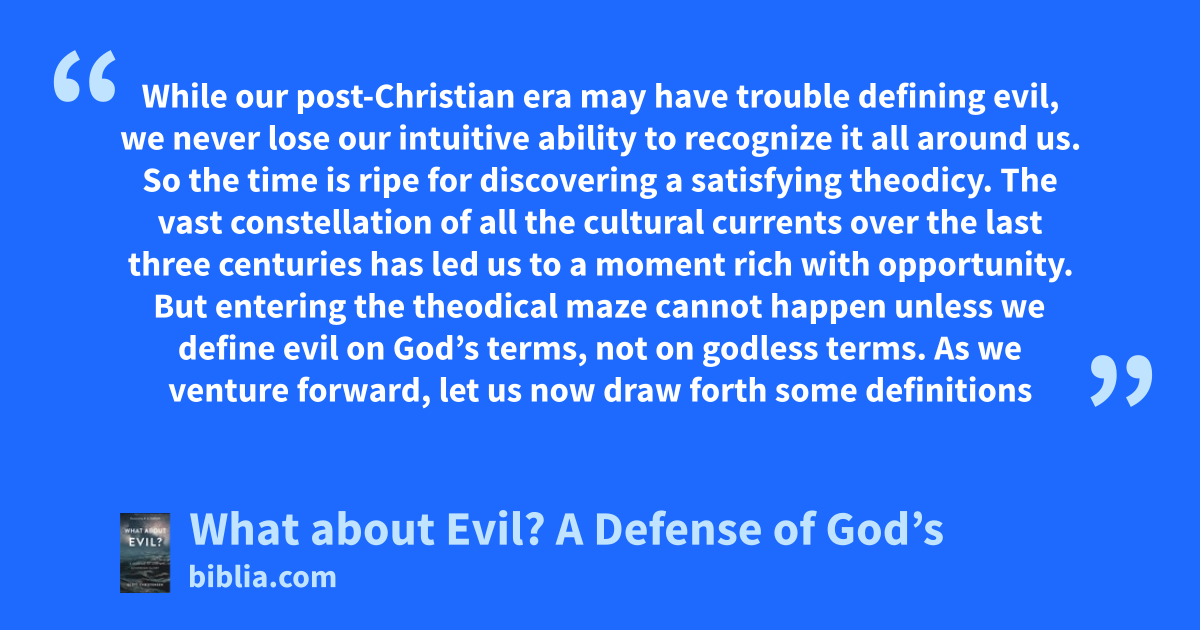 While our post-Christian era may have trouble defining evil, we never lose our intuitive ability to recognize it all around us. So the time is ripe for discovering a satisfying theodicy. The vast constellation of all the cultural currents over the last three centuries has led us to a moment rich with opportunity. But entering the theodical maze cannot happen unless we define evil on God’s terms, not on godless terms. As we venture forward, let us now draw forth some definitions