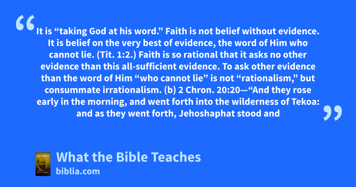 It is “taking God at his word.” Faith is not belief without evidence. It is belief on the very best of evidence, the word of Him who cannot lie. (Tit. 1:2.) Faith is so rational that it asks no other evidence than this all-sufficient evidence. To ask other evidence than the word of Him “who cannot lie” is not “rationalism,” but consummate irrationalism. (b) 2 Chron. 20:20—“And they rose early in the morning, and went forth into the wilderness of Tekoa: and as they went forth, Jehoshaphat stood and