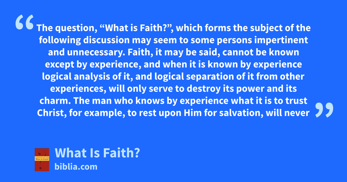 The question, “What is Faith?”, which forms the subject of the following discussion may seem to some persons impertinent and unnecessary. Faith, it may be said, cannot be known except by experience, and when it is known by experience logical analysis of it, and logical separation of it from other experiences, will only serve to destroy its power and its charm. The man who knows by experience what it is to trust Christ, for example, to rest upon Him for salvation, will never