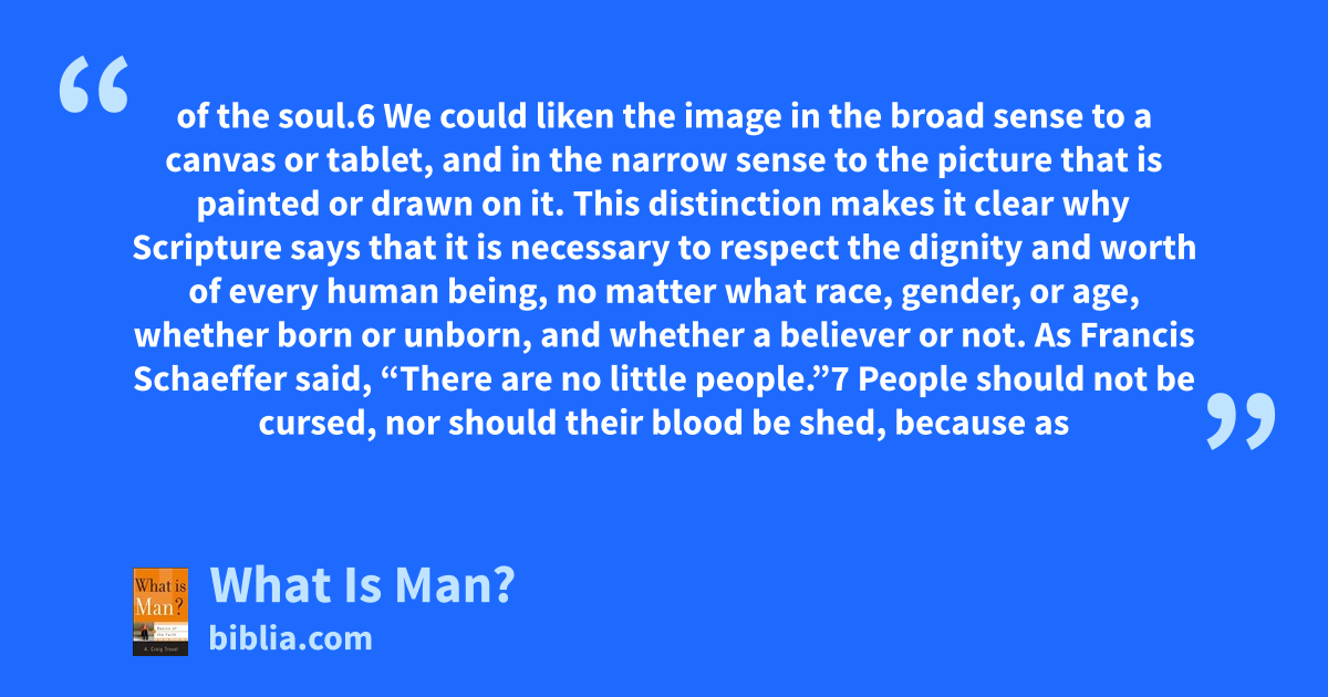 of the soul.6 We could liken the image in the broad sense to a canvas or tablet, and in the narrow sense to the picture that is painted or drawn on it. This distinction makes it clear why Scripture says that it is necessary to respect the dignity and worth of every human being, no matter what race, gender, or age, whether born or unborn, and whether a believer or not. As Francis Schaeffer said, “There are no little people.”7 People should not be cursed, nor should their blood be shed, because as
