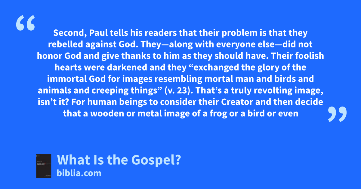 Second, Paul tells his readers that their problem is that they rebelled against God. They—along with everyone else—did not honor God and give thanks to him as they should have. Their foolish hearts were darkened and they “exchanged the glory of the immortal God for images resembling mortal man and birds and animals and creeping things” (v. 23). That’s a truly revolting image, isn’t it? For human beings to consider their Creator and then decide that a wooden or metal image of a frog or a bird or even