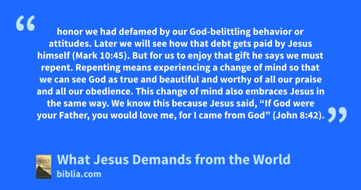 honor we had defamed by our God-belittling behavior or attitudes. Later we will see how that debt gets paid by Jesus himself (Mark 10:45). But for us to enjoy that gift he says we must repent. Repenting means experiencing a change of mind so that we can see God as true and beautiful and worthy of all our praise and all our obedience. This change of mind also embraces Jesus in the same way. We know this because Jesus said, “If God were your Father, you would love me, for I came from God” (John 8:42).