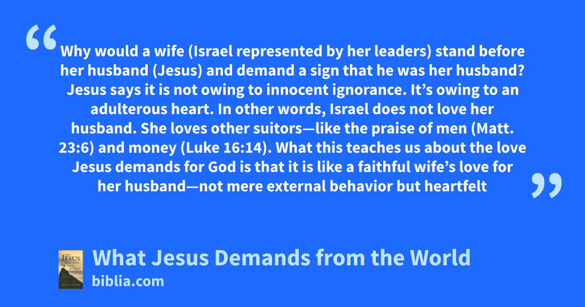 Why would a wife (Israel represented by her leaders) stand before her husband (Jesus) and demand a sign that he was her husband? Jesus says it is not owing to innocent ignorance. It’s owing to an adulterous heart. In other words, Israel does not love her husband. She loves other suitors—like the praise of men (Matt. 23:6) and money (Luke 16:14). What this teaches us about the love Jesus demands for God is that it is like a faithful wife’s love for her husband—not mere external behavior but heartfelt