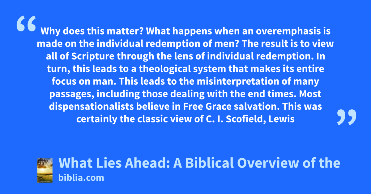 Why does this matter? What happens when an overemphasis is made on the individual redemption of men? The result is to view all of Scripture through the lens of individual redemption. In turn, this leads to a theological system that makes its entire focus on man. This leads to the misinterpretation of many passages, including those dealing with the end times. Most dispensationalists believe in Free Grace salvation. This was certainly the classic view of C. I. Scofield, Lewis