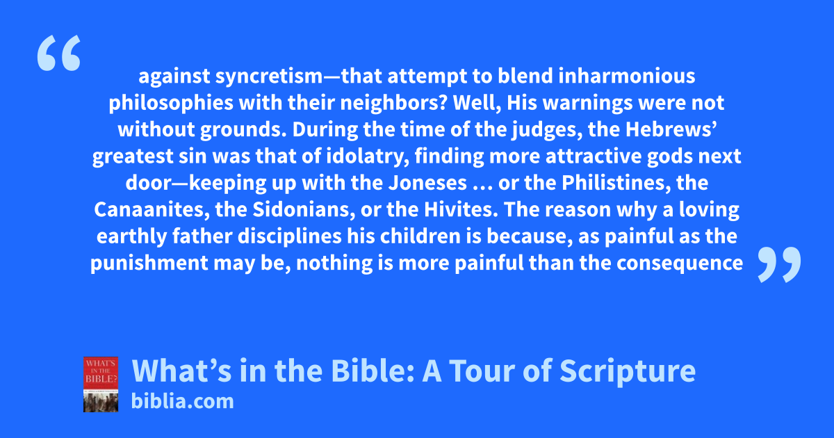 against syncretism—that attempt to blend inharmonious philosophies with their neighbors? Well, His warnings were not without grounds. During the time of the judges, the Hebrews’ greatest sin was that of idolatry, finding more attractive gods next door—keeping up with the Joneses … or the Philistines, the Canaanites, the Sidonians, or the Hivites. The reason why a loving earthly father disciplines his children is because, as painful as the punishment may be, nothing is more painful than the consequence
