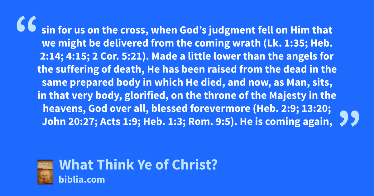 sin for us on the cross, when God’s judgment fell on Him that we might be delivered from the coming wrath (Lk. 1:35; Heb. 2:14; 4:15; 2 Cor. 5:21). Made a little lower than the angels for the suffering of death, He has been raised from the dead in the same prepared body in which He died, and now, as Man, sits, in that very body, glorified, on the throne of the Majesty in the heavens, God over all, blessed forevermore (Heb. 2:9; 13:20; John 20:27; Acts 1:9; Heb. 1:3; Rom. 9:5). He is coming again,