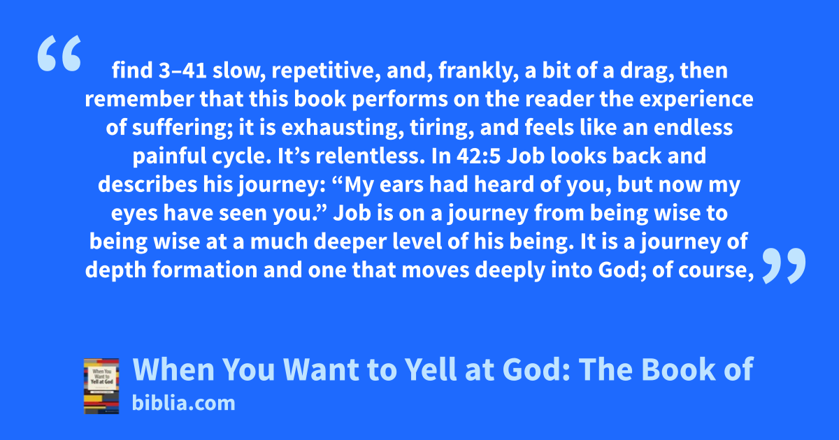 find 3–41 slow, repetitive, and, frankly, a bit of a drag, then remember that this book performs on the reader the experience of suffering; it is exhausting, tiring, and feels like an endless painful cycle. It’s relentless. In 42:5 Job looks back and describes his journey: “My ears had heard of you, but now my eyes have seen you.” Job is on a journey from being wise to being wise at a much deeper level of his being. It is a journey of depth formation and one that moves deeply into God; of course,