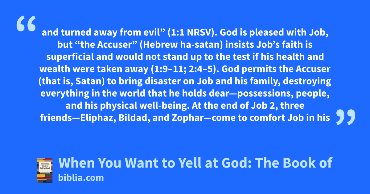 and turned away from evil” (1:1 NRSV). God is pleased with Job, but “the Accuser” (Hebrew ha-satan) insists Job’s faith is superficial and would not stand up to the test if his health and wealth were taken away (1:9–11; 2:4–5). God permits the Accuser (that is, Satan) to bring disaster on Job and his family, destroying everything in the world that he holds dear—possessions, people, and his physical well-being. At the end of Job 2, three friends—Eliphaz, Bildad, and Zophar—come to comfort Job in his