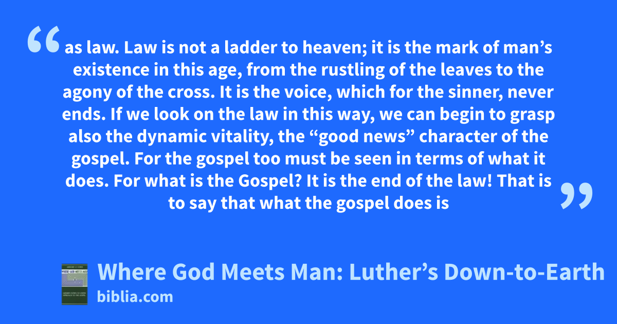 as law. Law is not a ladder to heaven; it is the mark of man’s existence in this age, from the rustling of the leaves to the agony of the cross. It is the voice, which for the sinner, never ends. If we look on the law in this way, we can begin to grasp also the dynamic vitality, the “good news” character of the gospel. For the gospel too must be seen in terms of what it does. For what is the Gospel? It is the end of the law! That is to say that what the gospel does is