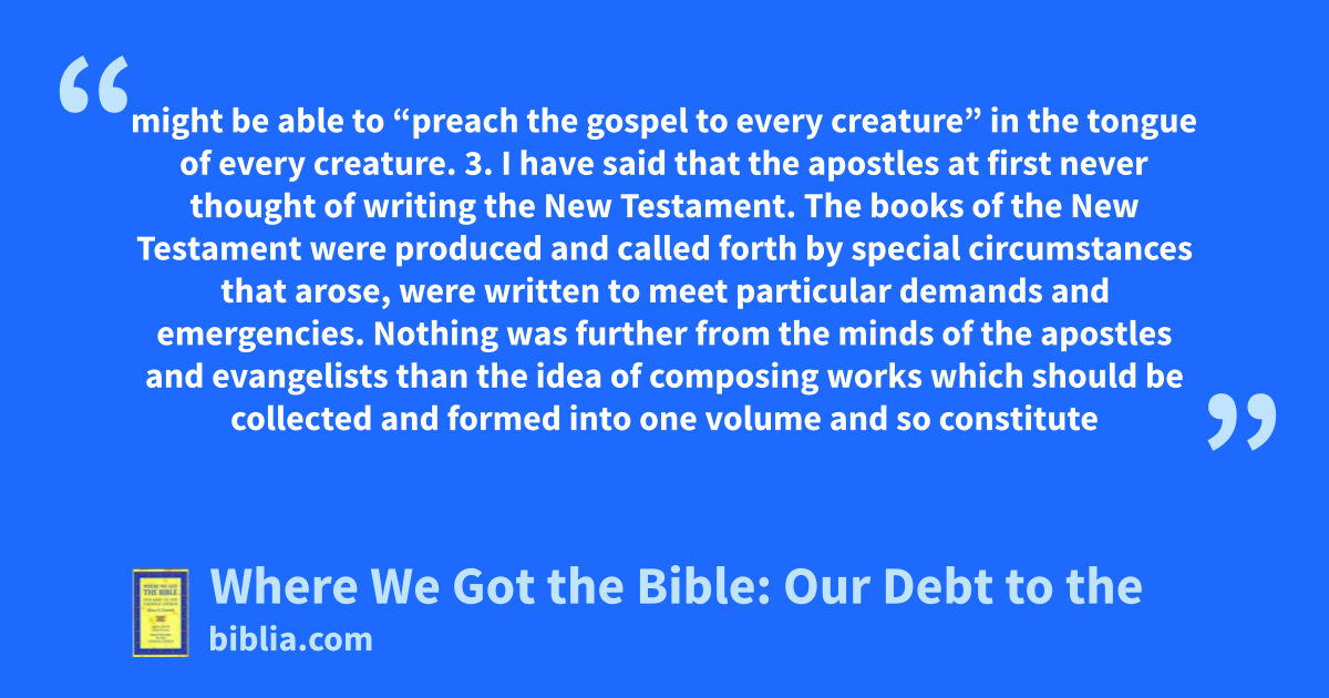might be able to “preach the gospel to every creature” in the tongue of every creature. 3. I have said that the apostles at first never thought of writing the New Testament. The books of the New Testament were produced and called forth by special circumstances that arose, were written to meet particular demands and emergencies. Nothing was further from the minds of the apostles and evangelists than the idea of composing works which should be collected and formed into one volume and so constitute