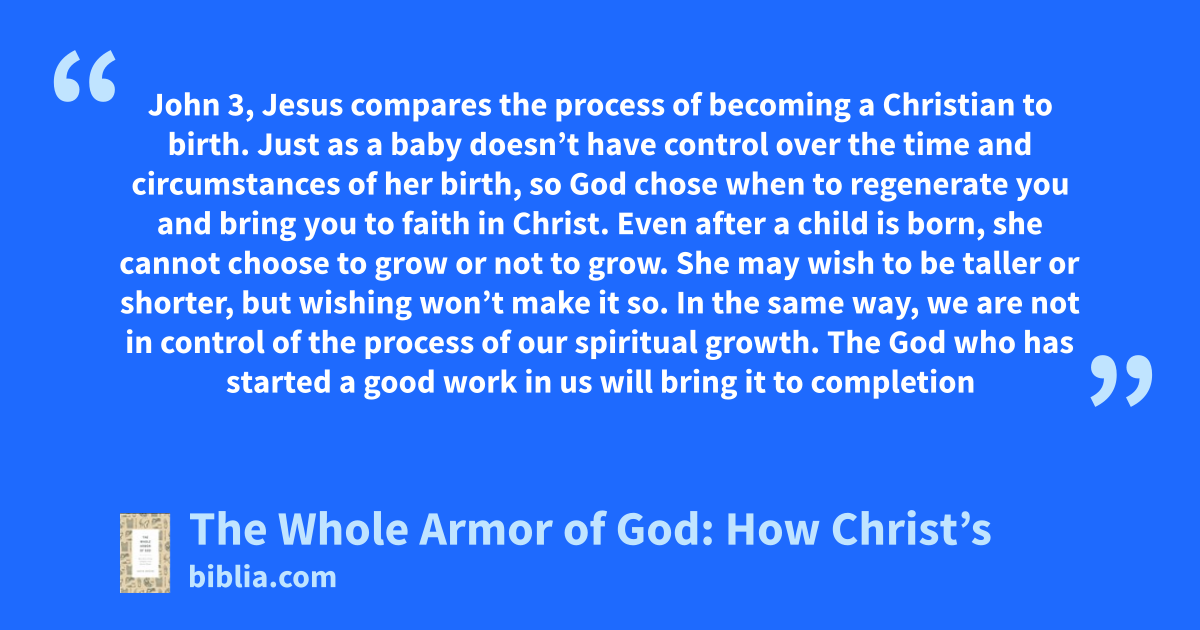 John 3, Jesus compares the process of becoming a Christian to birth. Just as a baby doesn’t have control over the time and circumstances of her birth, so God chose when to regenerate you and bring you to faith in Christ. Even after a child is born, she cannot choose to grow or not to grow. She may wish to be taller or shorter, but wishing won’t make it so. In the same way, we are not in control of the process of our spiritual growth. The God who has started a good work in us will bring it to completion