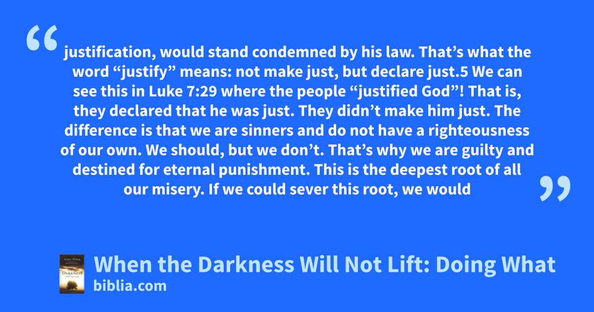 justification, would stand condemned by his law. That’s what the word “justify” means: not make just, but declare just.5 We can see this in Luke 7:29 where the people “justified God”! That is, they declared that he was just. They didn’t make him just. The difference is that we are sinners and do not have a righteousness of our own. We should, but we don’t. That’s why we are guilty and destined for eternal punishment. This is the deepest root of all our misery. If we could sever this root, we would