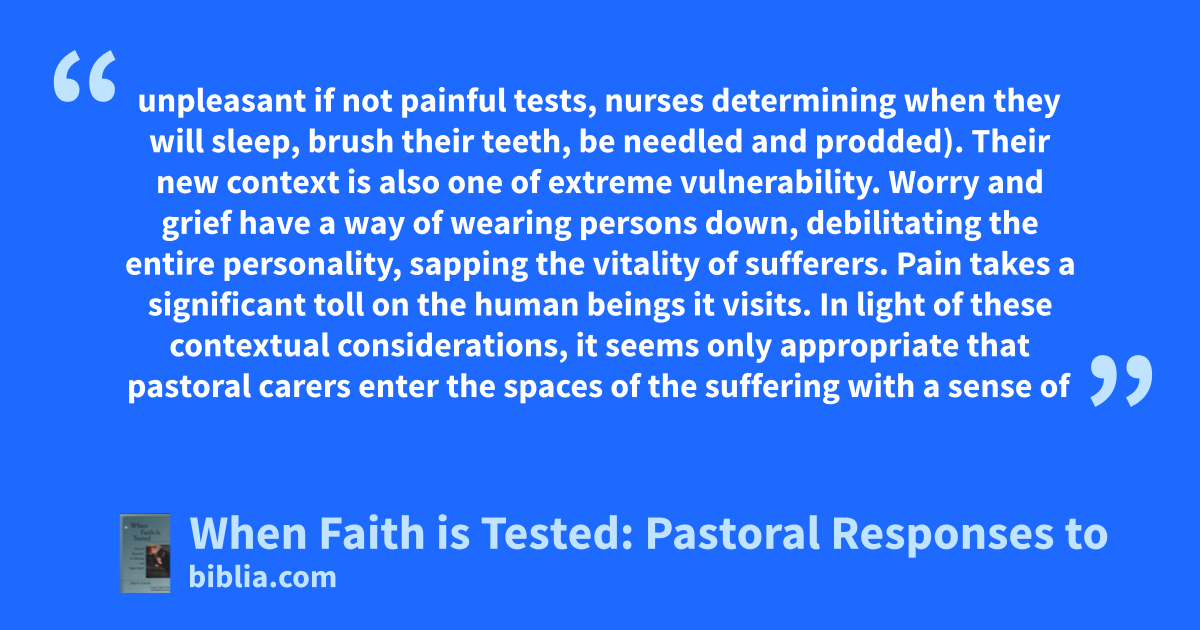 unpleasant if not painful tests, nurses determining when they will sleep, brush their teeth, be needled and prodded). Their new context is also one of extreme vulnerability. Worry and grief have a way of wearing persons down, debilitating the entire personality, sapping the vitality of sufferers. Pain takes a significant toll on the human beings it visits. In light of these contextual considerations, it seems only appropriate that pastoral carers enter the spaces of the suffering with a sense of
