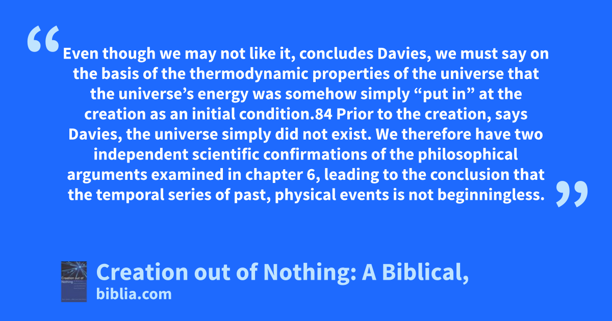 Even though we may not like it, concludes Davies, we must say on the basis of the thermodynamic properties of the universe that the universe’s energy was somehow simply “put in” at the creation as an initial condition.84 Prior to the creation, says Davies, the universe simply did not exist. We therefore have two independent scientific confirmations of the philosophical arguments examined in chapter 6, leading to the conclusion that the temporal series of past, physical events is not beginningless.