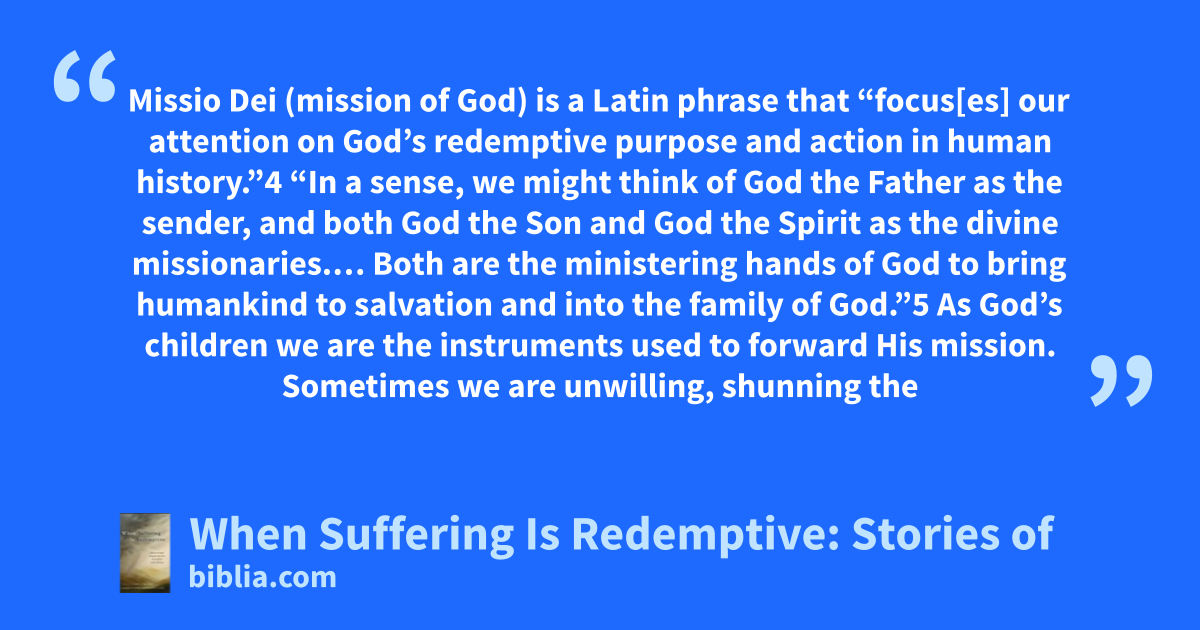 Missio Dei (mission of God) is a Latin phrase that “focus[es] our attention on God’s redemptive purpose and action in human history.”4 “In a sense, we might think of God the Father as the sender, and both God the Son and God the Spirit as the divine missionaries.… Both are the ministering hands of God to bring humankind to salvation and into the family of God.”5 As God’s children we are the instruments used to forward His mission. Sometimes we are unwilling, shunning the