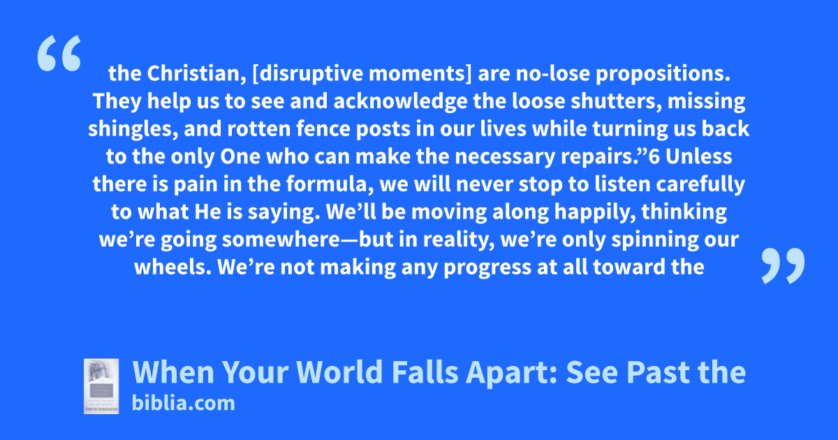 the Christian, [disruptive moments] are no-lose propositions. They help us to see and acknowledge the loose shutters, missing shingles, and rotten fence posts in our lives while turning us back to the only One who can make the necessary repairs.”6 Unless there is pain in the formula, we will never stop to listen carefully to what He is saying. We’ll be moving along happily, thinking we’re going somewhere—but in reality, we’re only spinning our wheels. We’re not making any progress at all toward the