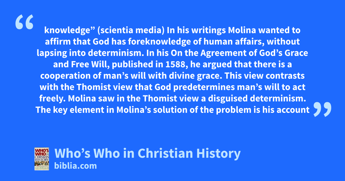 knowledge” (scientia media) In his writings Molina wanted to affirm that God has foreknowledge of human affairs, without lapsing into determinism. In his On the Agreement of God’s Grace and Free Will, published in 1588, he argued that there is a cooperation of man’s will with divine grace. This view contrasts with the Thomist view that God predetermines man’s will to act freely. Molina saw in the Thomist view a disguised determinism. The key element in Molina’s solution of the problem is his account