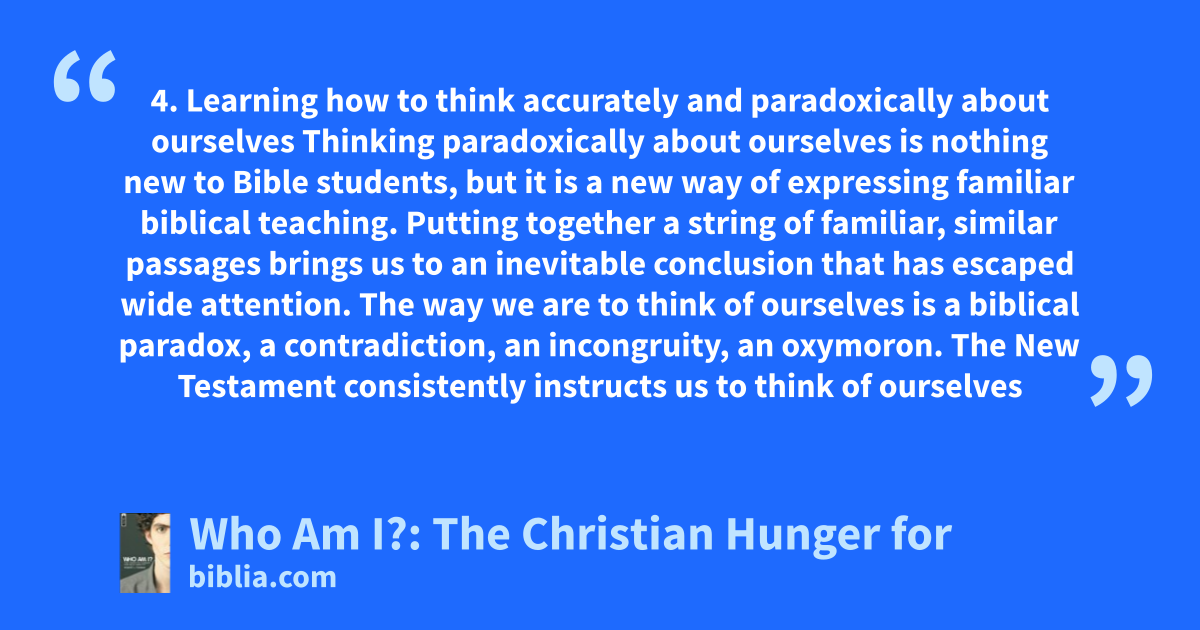 4. Learning how to think accurately and paradoxically about ourselves Thinking paradoxically about ourselves is nothing new to Bible students, but it is a new way of expressing familiar biblical teaching. Putting together a string of familiar, similar passages brings us to an inevitable conclusion that has escaped wide attention. The way we are to think of ourselves is a biblical paradox, a contradiction, an incongruity, an oxymoron. The New Testament consistently instructs us to think of ourselves