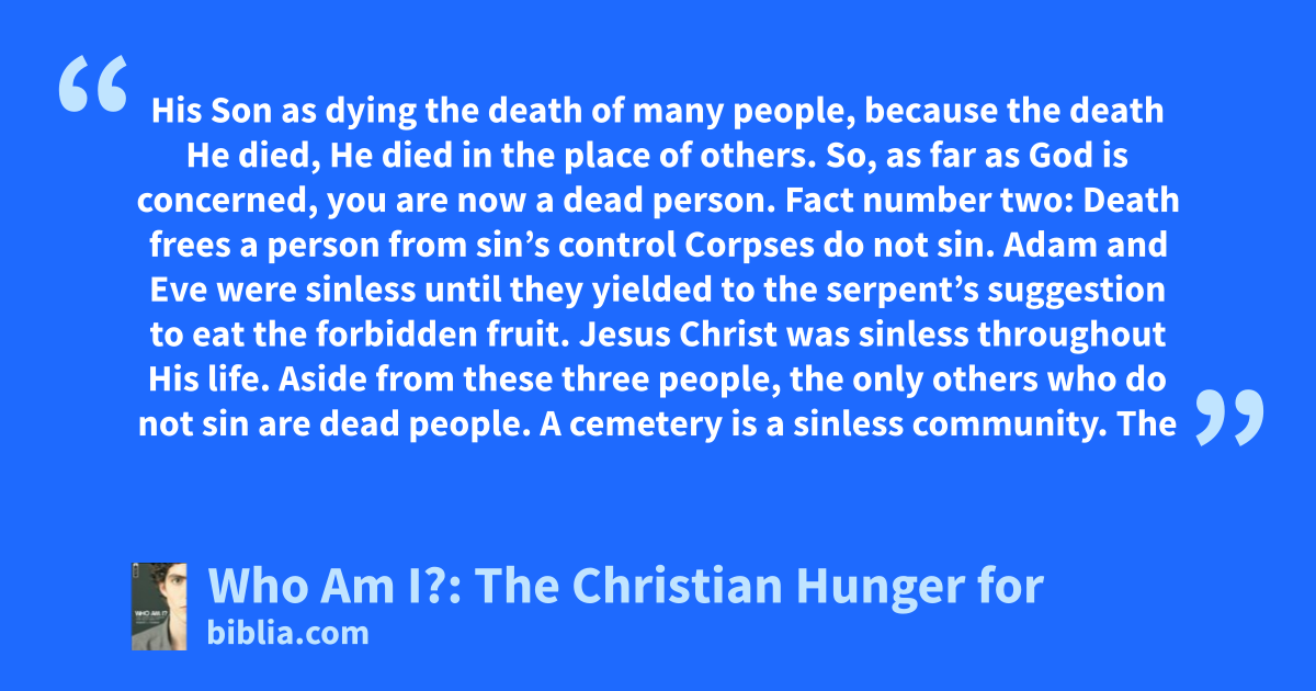 His Son as dying the death of many people, because the death He died, He died in the place of others. So, as far as God is concerned, you are now a dead person. Fact number two: Death frees a person from sin’s control Corpses do not sin. Adam and Eve were sinless until they yielded to the serpent’s suggestion to eat the forbidden fruit. Jesus Christ was sinless throughout His life. Aside from these three people, the only others who do not sin are dead people. A cemetery is a sinless community. The